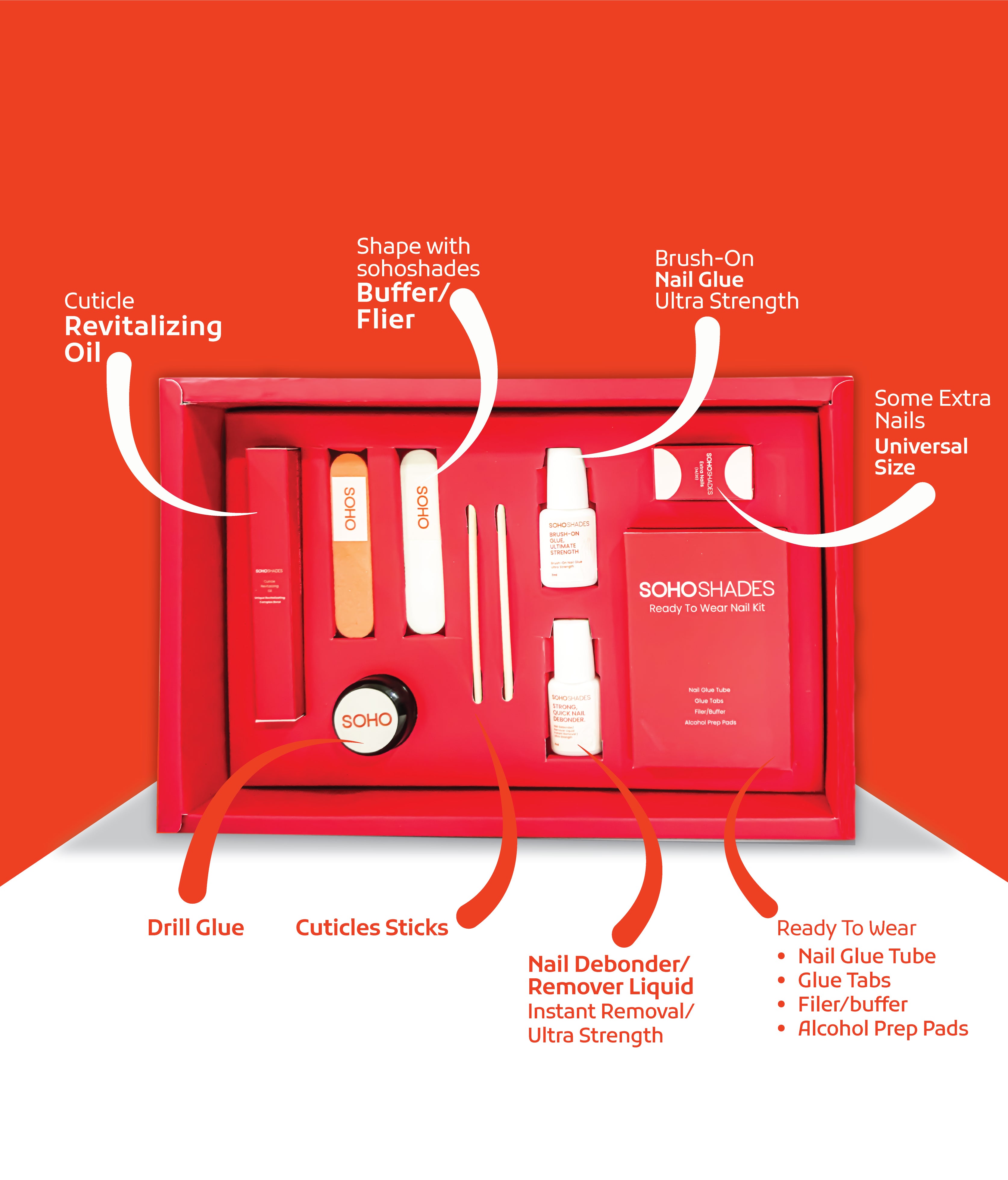 4. #strongestnailchallenge Kit: Most Durable, with our new SohoShades Forever Liquid Glue, complete your needs with tools and cuticle care products. 4-level application kit 3 new levels introduced on top of conventional methods, mentioned below: Ready-to-Wear: Pre-designed nails ready to put on; save your time and effort.